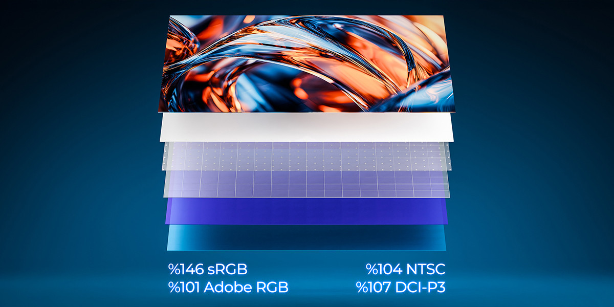 %146 sRGB, %104 NTSC, %101 Adobe RGB ve %107 DCI-P3 desteği ile her sahnede olağanüstü renk doğruluğu.