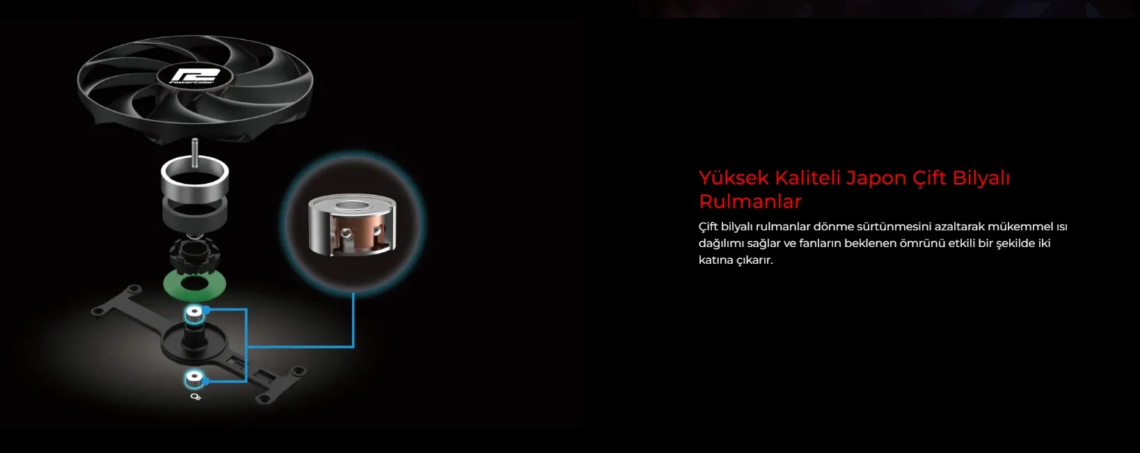 Çift bilyalı rulmanlar dönme sürtünmesini azaltarak mükemmel ısı dağılımı sağlar ve fanların beklenen ömrünü etkili bir şekilde iki katına çıkarır.