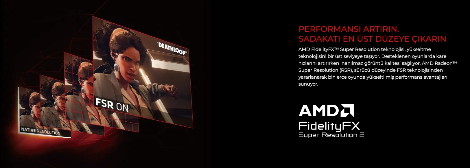 AMD FidelityFX™ Super Resolution teknolojisi, yükseltme teknolojisini bir üst seviyeye taşıyor. Desteklenen oyunlarda kare hızlarını artırırken inanılmaz görüntü kalitesi sağlıyor. AMD Radeon™ Super Resolution (RSR), sürücü düzeyinde FSR teknolojisinden yararlanarak binlerce oyunda yükseltilmiş performans avantajları sunuyor.
